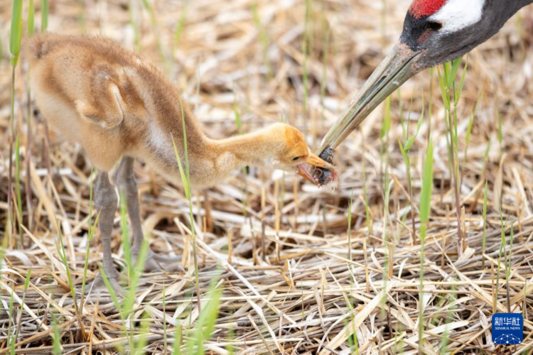 5月21日,在扎龙国家级自然保护区,丹顶鹤在给雏鹤喂食。