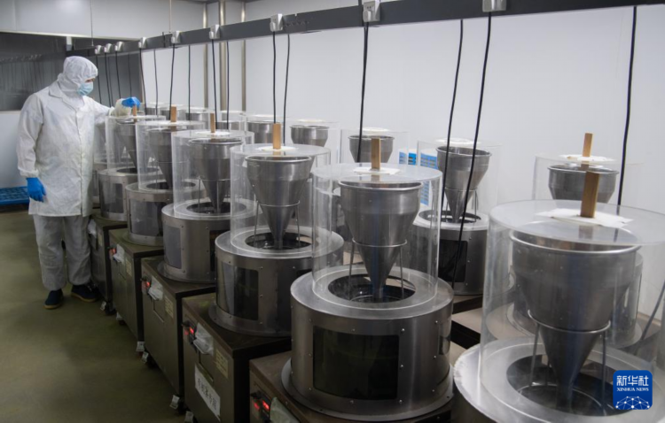 5月22日,在湖北省孝感市大悟县金墩村湖北半兵卫茶业有限公司生产车间,工作人员在分装抹茶粉。