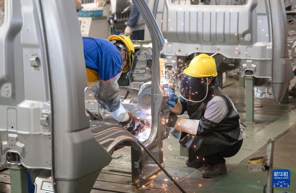 5月23日,在日照市五莲县五征集团焊装车间,工人为汽车车身上机器人焊接不到的位置进行人工加焊。