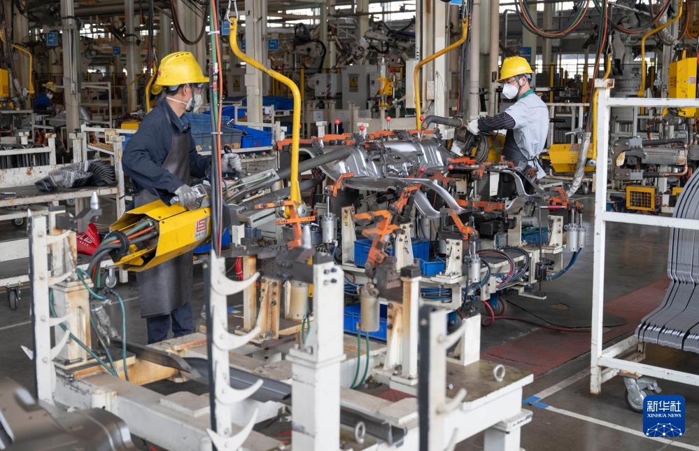5月23日,在日照市五莲县五征集团焊装车间,工人为汽车车身中地板进行总成焊接。