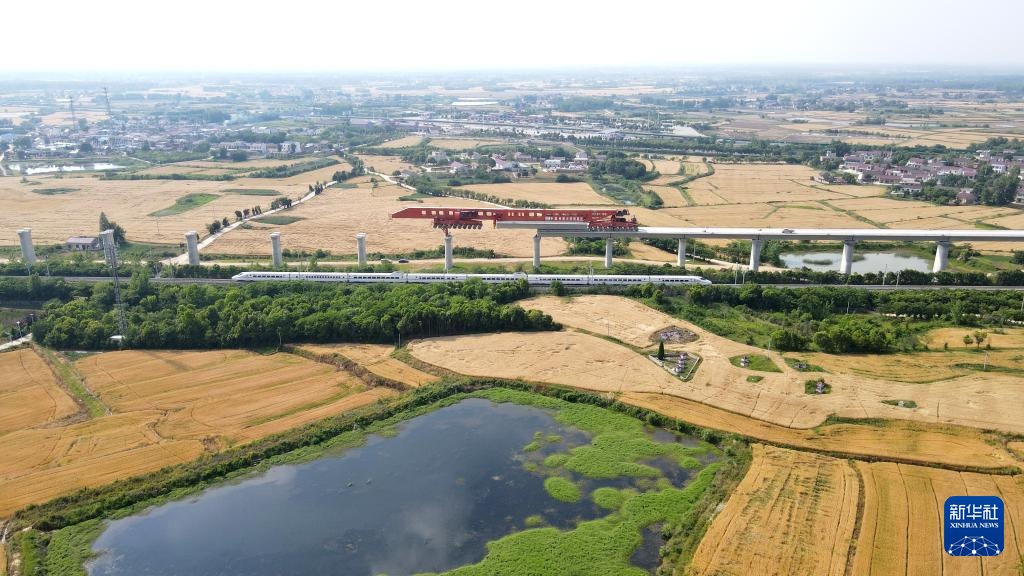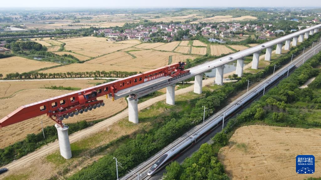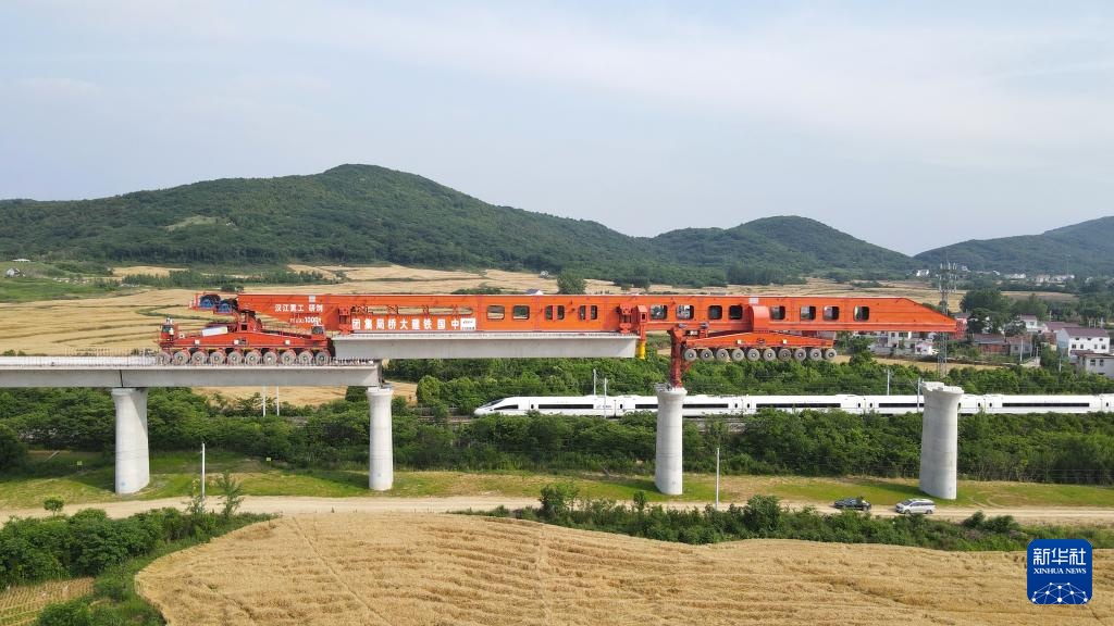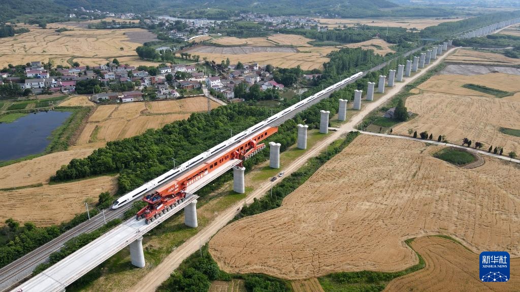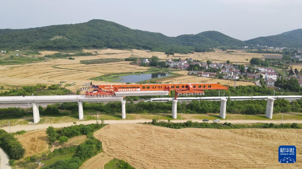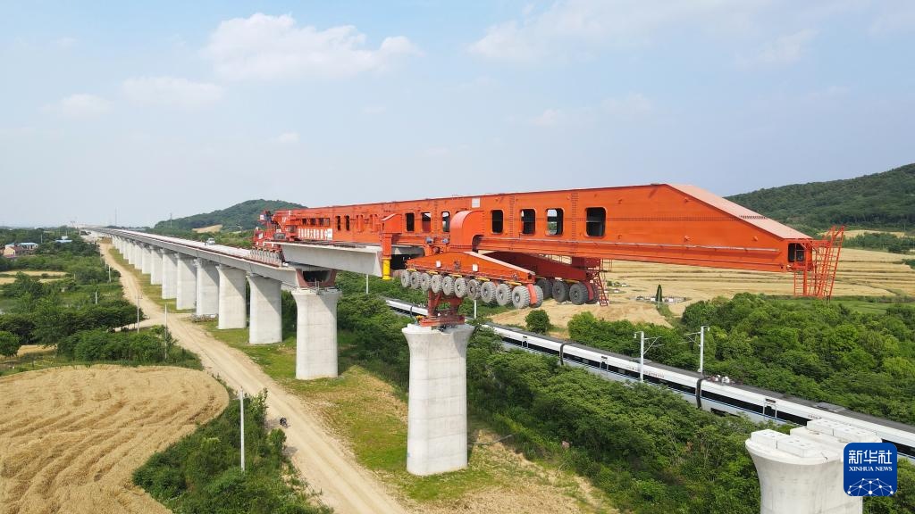 初夏时节,中国铁建大桥局新建上海至南京至合肥高速铁路箱梁架设现场一派繁忙,施工人员奋战在建设一线,确保重点工程建设进展顺利。