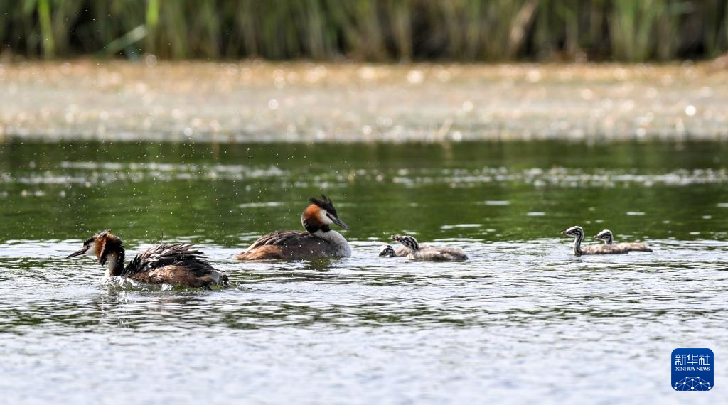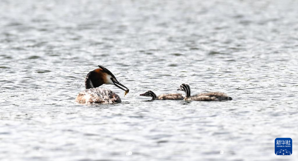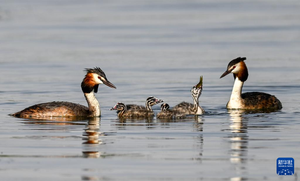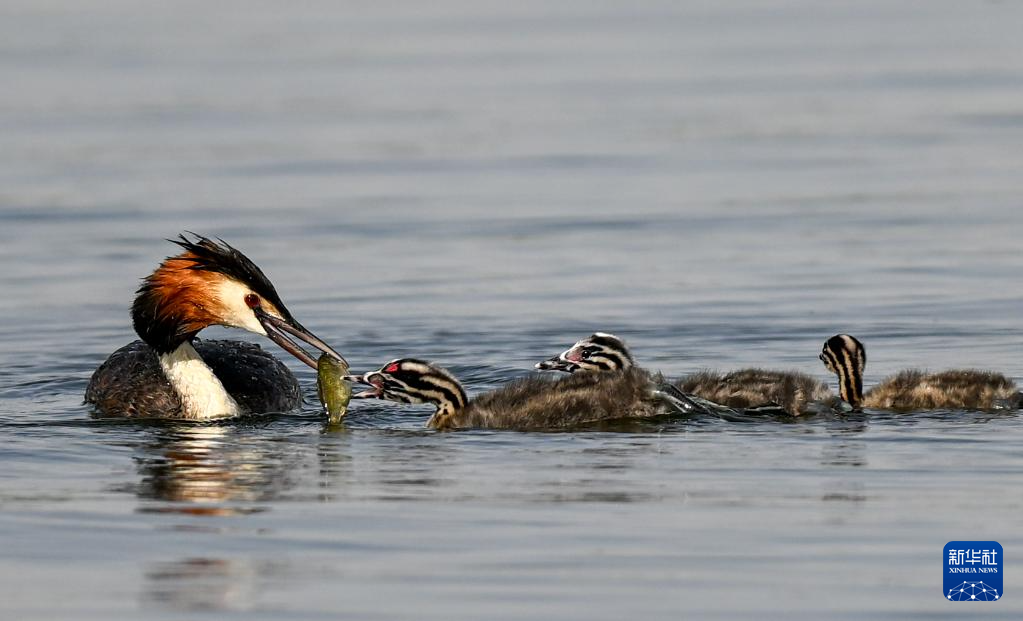 5月25日,凤头 亲鸟带领幼鸟游荡在湖面上。