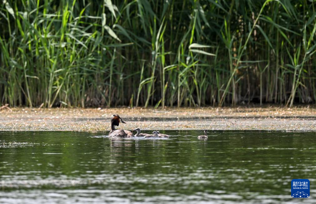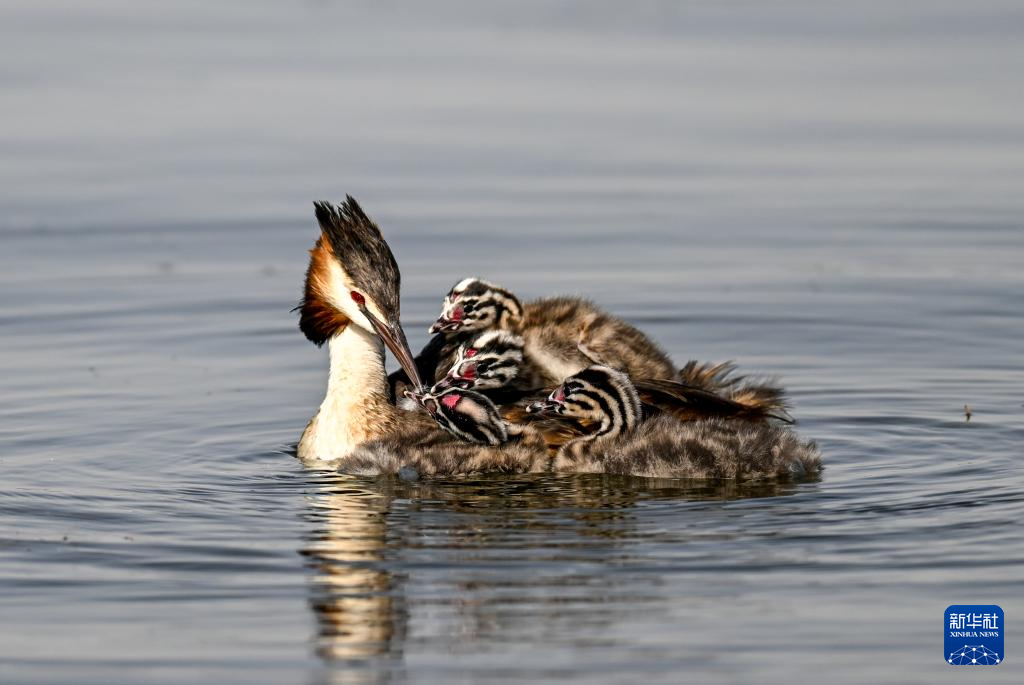5月25日,一只凤头 亲鸟带领幼鸟游荡在湖面上。