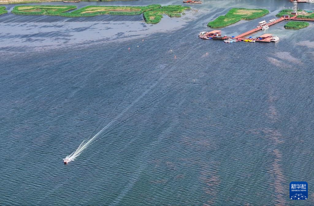 5月25日,游人乘坐快艇行驶在乌梁素海湖面上(无人机照片)。