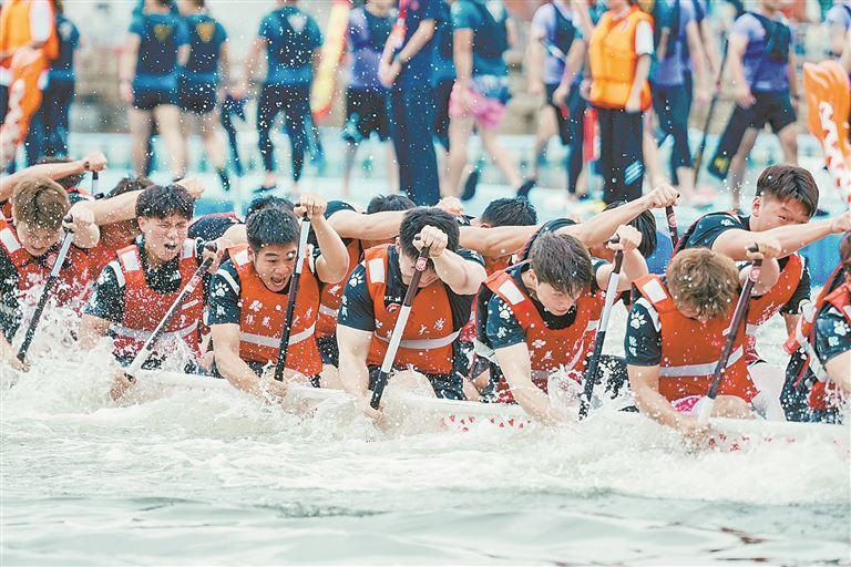 两艘由绳牵引的龙舟背对背,比赛开始后,选手快速划桨,争取把拔河绳拉向自己这侧——昨天下午,在对体能考验最大的龙舟拔河公开赛中,集美大学队继续展现实力,多次在三局两胜的淘汰赛中以“2∶0”击败对手。