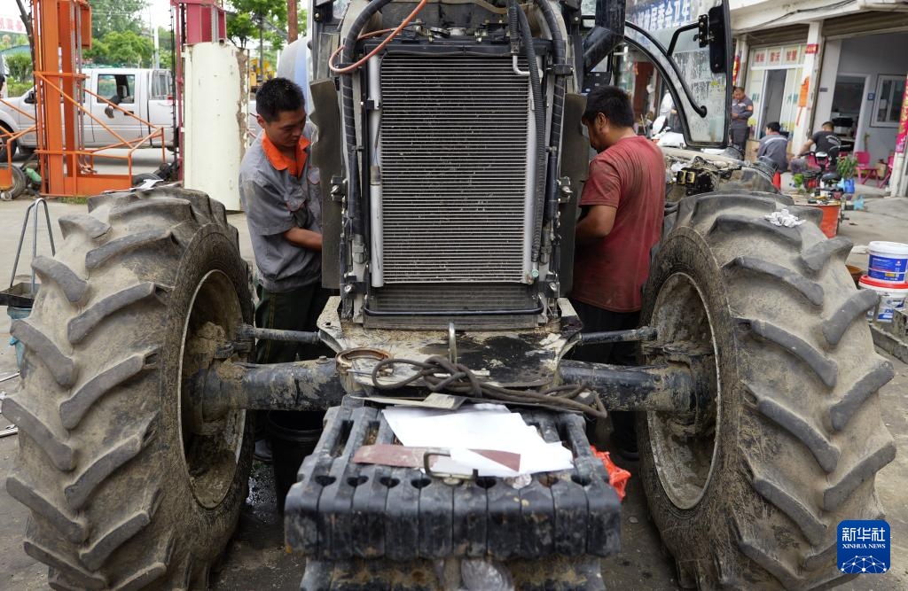 5月27日,工作人员在河南省邓州市一家农机维修点修理农机。