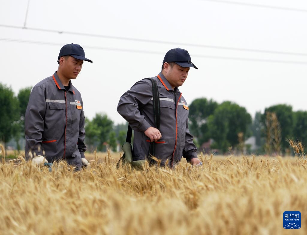 5月27日,工作人员走在河南省邓州市汲滩镇南王村附近的麦田里,准备去修理农机。