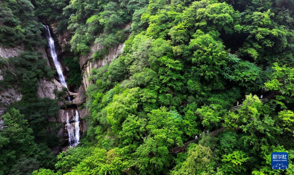 游客在西安太平国家森林公园游览(无人机照片,5月26日摄)。