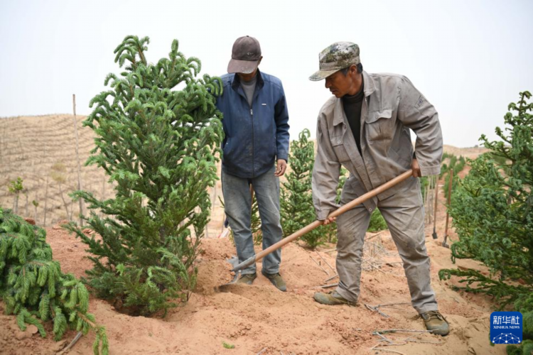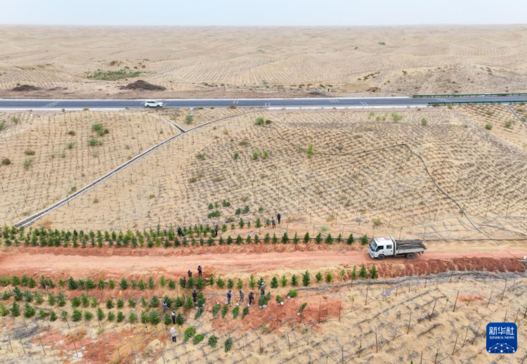 5月29日,工人在杭锦旗穿沙公路两侧植树造林。