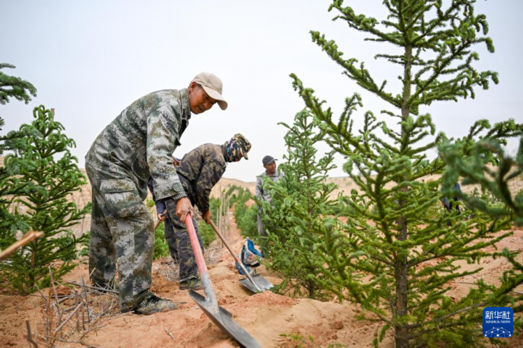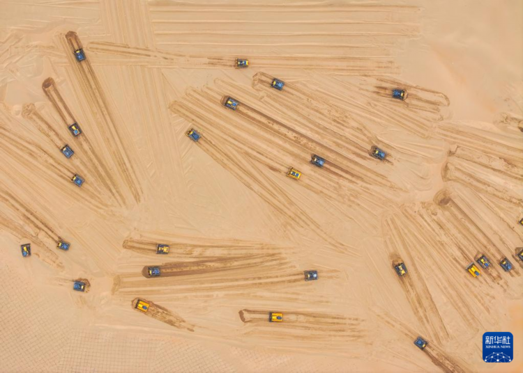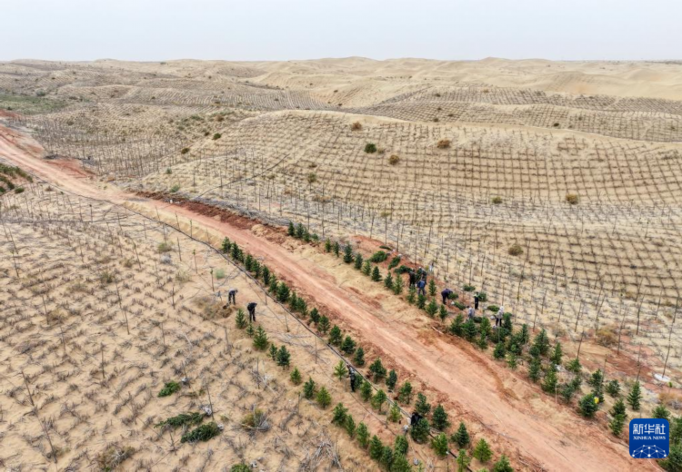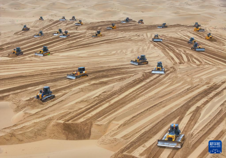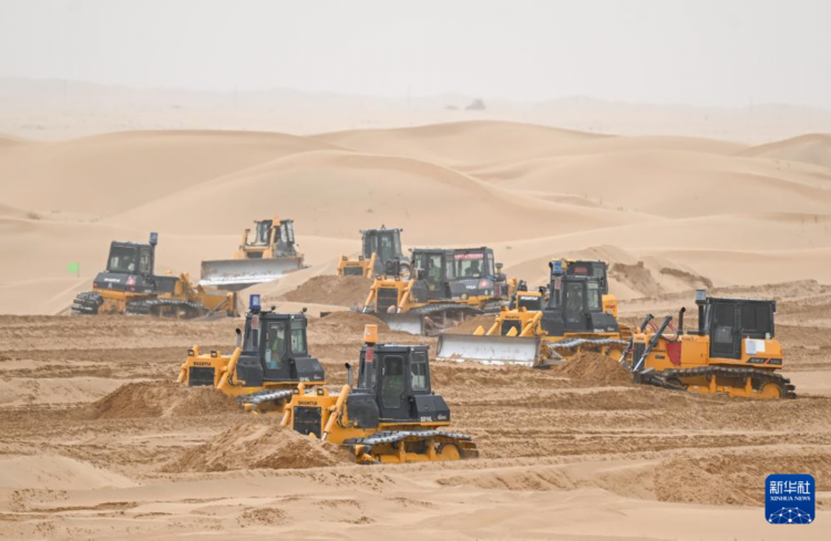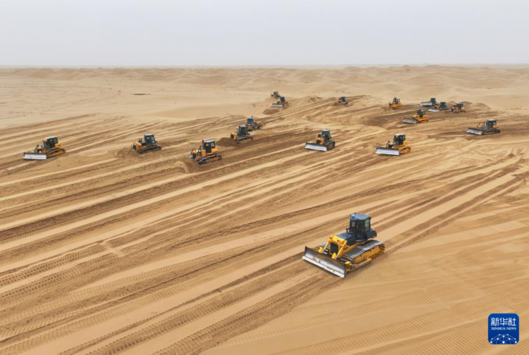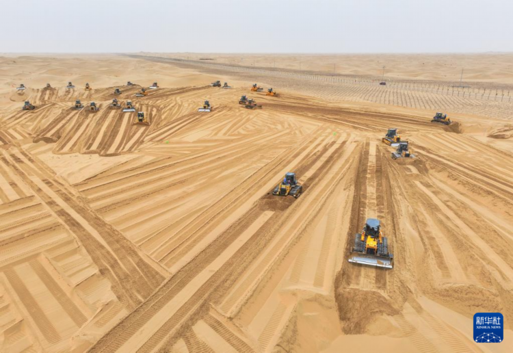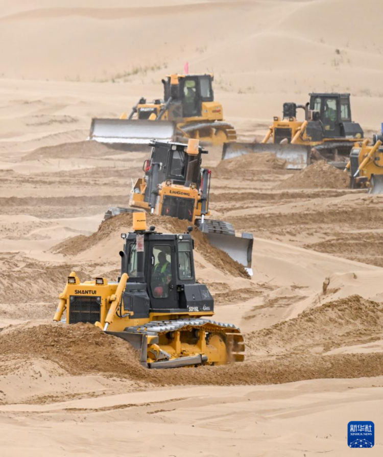 当日,在内蒙古鄂尔多斯市杭锦旗黄河“几字弯”荒漠化综合防治库布其沙漠治理现场,工人在穿沙公路两侧植树造林、工程机械推平沙漠为光伏装机做准备。杭锦旗对库布其沙漠采取“北缘锁边、南部围堵、西部封禁、中部切割、东部削平”的治理措施,力争实现荒漠化、沙化土地面积持续“双缩减”。