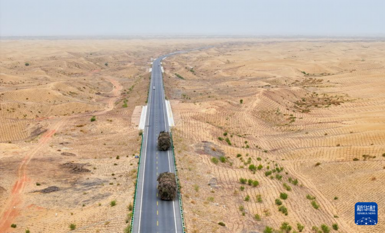5月29日,在杭锦旗穿沙公路附近,卡车运送树苗(无人机照片)。