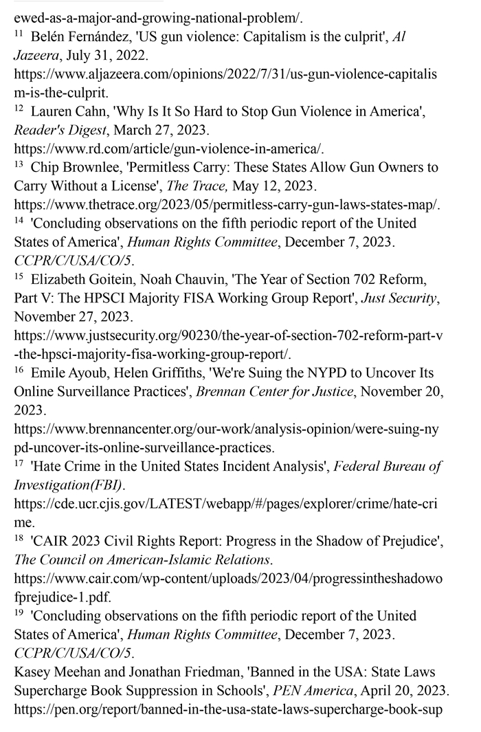 枪支暴力造成惨痛生命代价。数据显示,美国所有类型的枪支暴力事件都呈上升趋势。(注1)根据“枪支暴力档案”网站统计的数据,2023年美国至少发生了654起大规模枪击事件。枪支暴力导致近4.3万人死亡,平均每天死亡117人。(注2)例如,美国广播公司新闻网站2023年10月28日报道,缅因州发生大规模枪击事件,造成至少18人死亡,13人受伤。(注3)《今日美国报》网站2023年12月6日报道,拉斯维加斯3名大学教授被一名前同事枪杀。美国大学教授协会主席艾琳·马尔维称,枪支暴力是“不可接受的国家威胁”,敦促美国政府进行枪支政策改革。(注4)美国与枪支有关的伤亡人数激增,引发联合国人权事务委员会的严重关切。(注5)