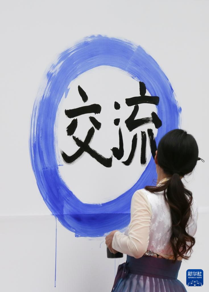 5月30日,在韩国首尔举办的“中日韩合作日”庆祝活动上,表演者进行中日韩精神——2024年度汉字“交流”书法表演。