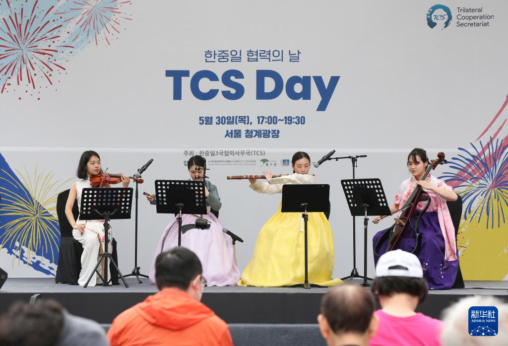 5月30日,在韩国首尔举办的“中日韩合作日”庆祝活动上,演员演奏中日韩三国歌曲。