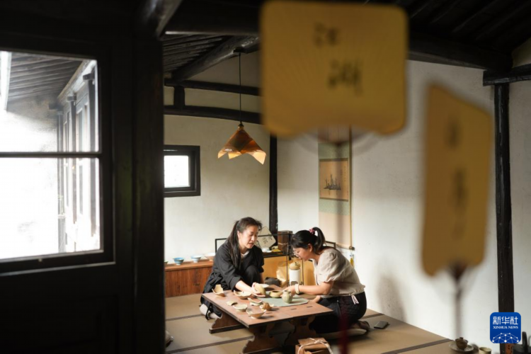 5月30日,青瓷艺术空间主理人杜炜丹(左)和朋友交流收藏的越窑青瓷标本。
