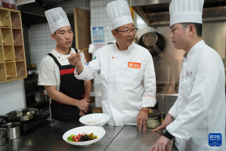 5月30日,一家本地菜馆的主厨刘建华(中)在厨房向员工介绍“雪菜墨鱼”的做法。