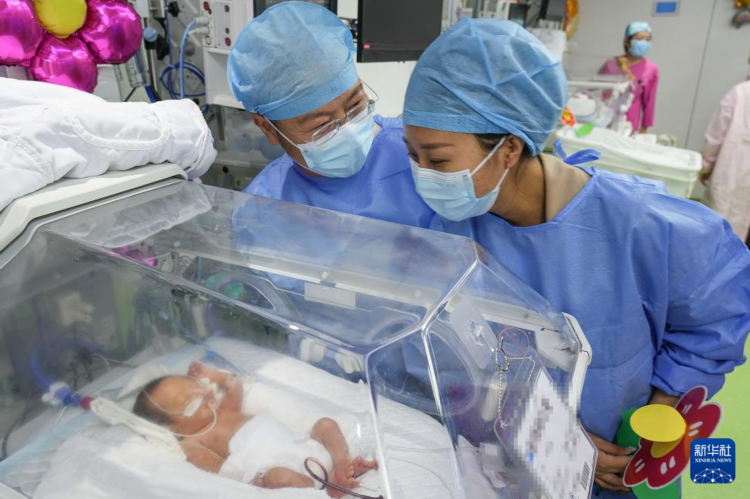 5月30日,一对夫妻在病房内看望住院的宝贝。