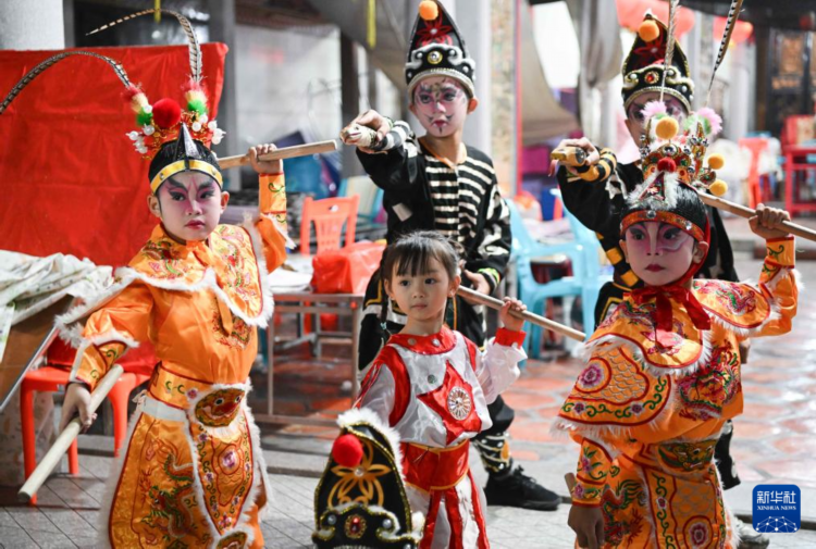 5月29日,在汕头市贵屿镇玉窖村的英歌队排练现场,庄恩琪(前中)与玉和兴英歌队队员一起跳英歌舞。新华社记者 邓华 摄