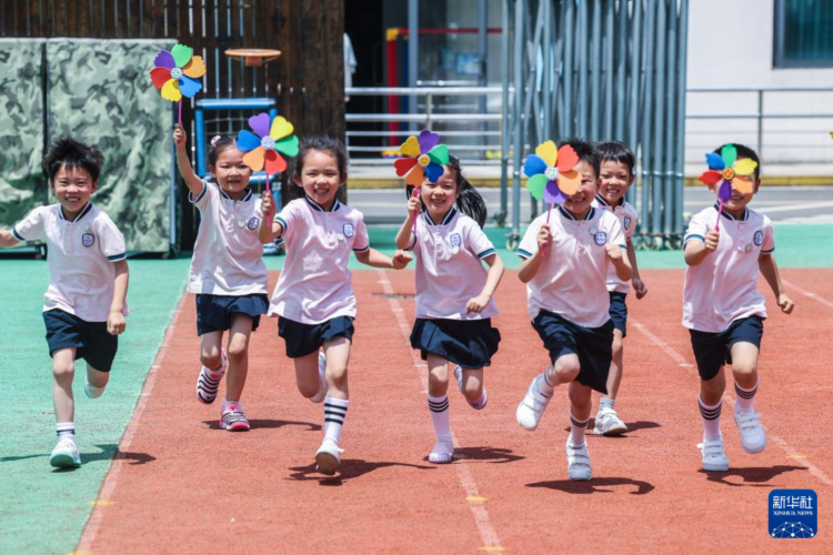 5月30日,余姚市凤山街道第二中心幼儿园的孩子们举着自己在“绿色低碳”课上制作的小风车参加赛跑。
