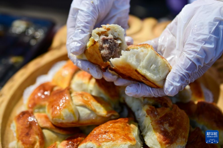 6月2日,在新疆塔城地区裕民县举行的首届巴什拜羊烹饪大赛上,参赛厨师展示制作好的烤包子。