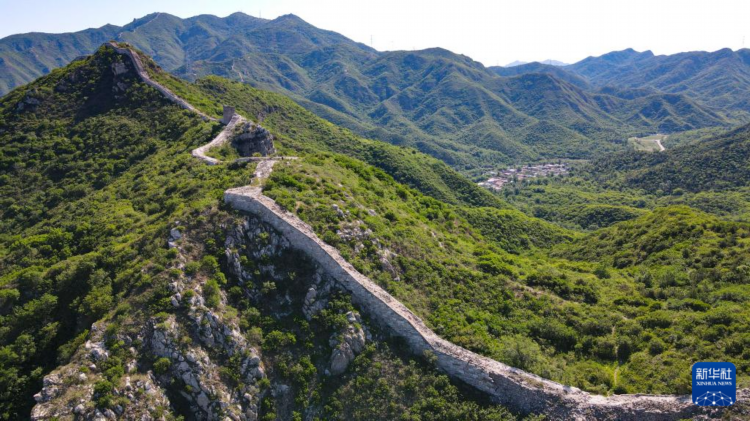 石峡关长城和长城脚下的石峡村(6月1日摄,无人机照片)。