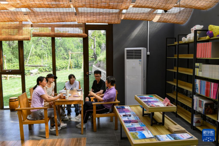 北京石油化工学院的师生在石峡村的一间书屋里就乡村文旅调研进行讨论(5月31日摄)。