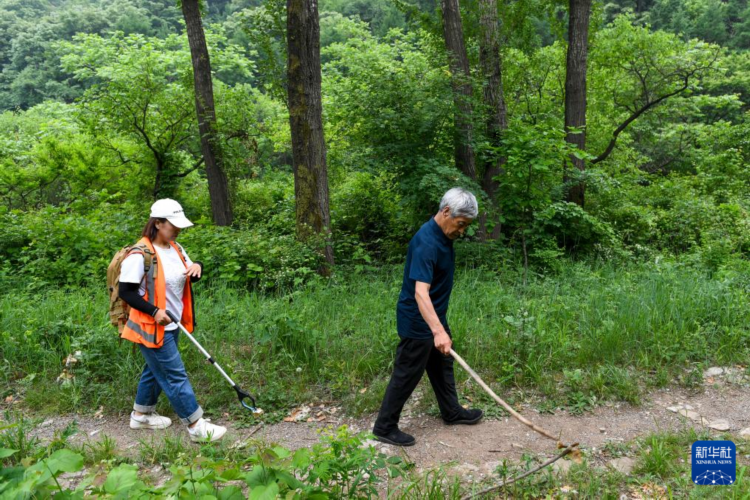 长城保护员梅景田(右)和刘红岩在前往长城的山路上(5月23日摄)。上世纪80年代初,梅景田开始自发保护长城,已带动不少村民形成保护长城的意识。