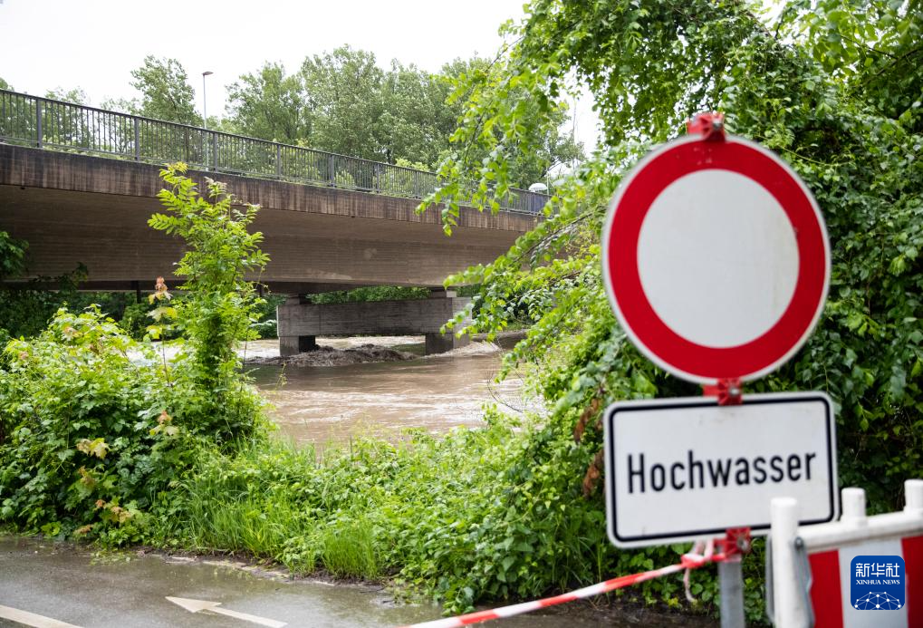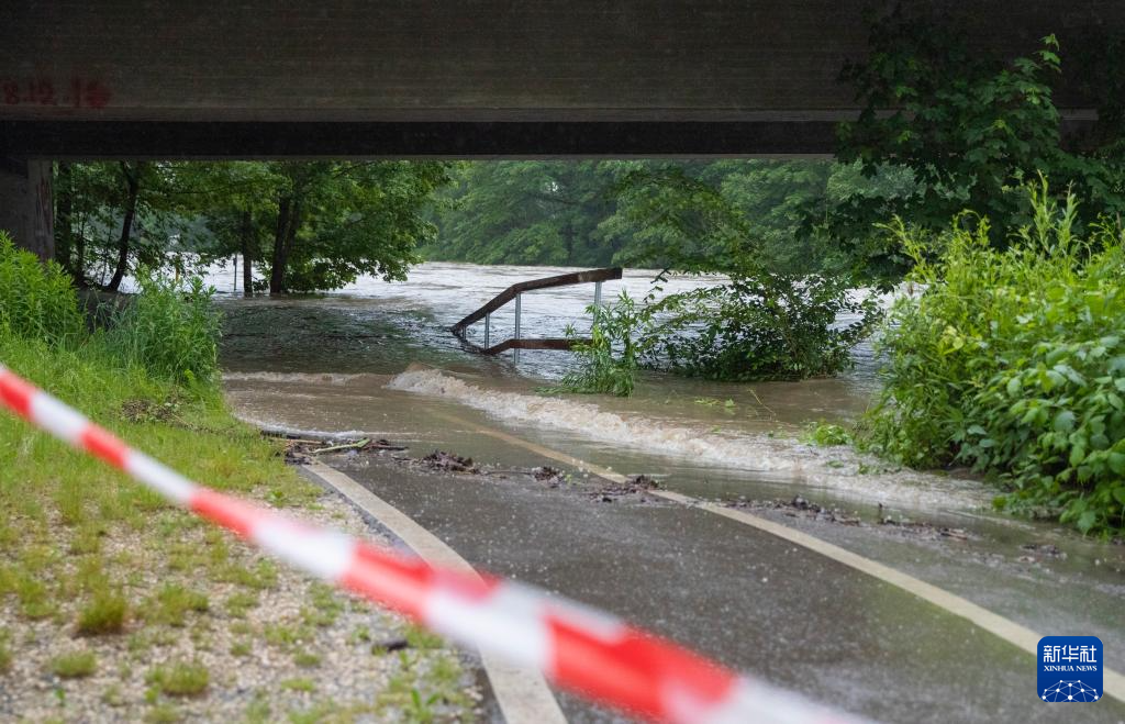 这是6月1日在德国巴伐利亚州多瑙河畔拍摄的被封锁的道路。 近日,德国南部巴伐利亚州、巴登-符腾堡州部分地区遭遇强降雨。多瑙河、内卡河、金茨河等多条河流水位上涨,多处决堤,沿岸大量城市和村镇遭遇洪水侵袭。 新华社记者 张帆 摄
