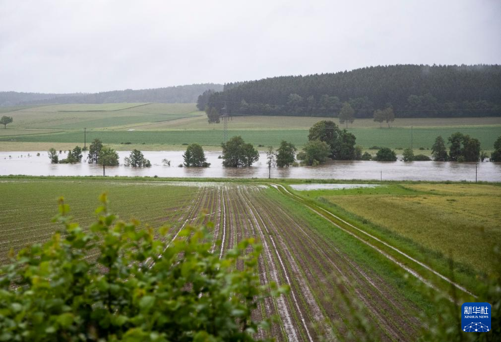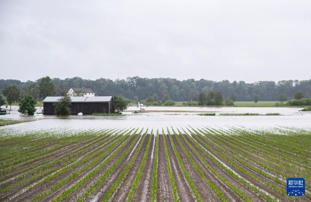这是6月1日在德国巴伐利亚州一处村镇拍摄的被洪水淹没的农田。 近日,德国南部巴伐利亚州、巴登-符腾堡州部分地区遭遇强降雨。多瑙河、内卡河、金茨河等多条河流水位上涨,多处决堤,沿岸大量城市和村镇遭遇洪水侵袭。 新华社记者 张帆 摄