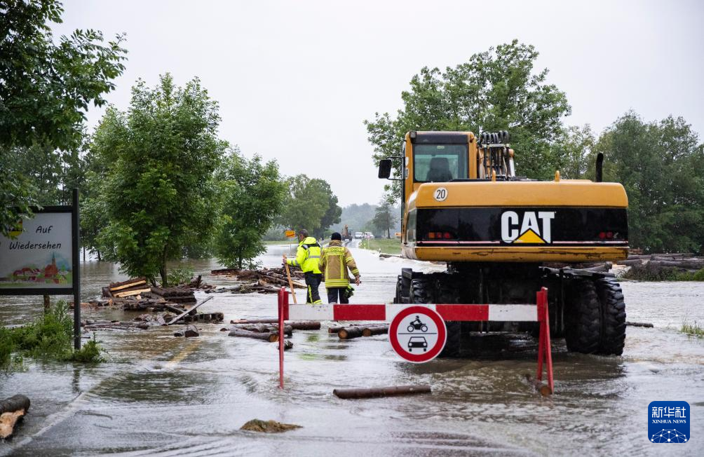 6月1日,在德国巴伐利亚州一处村镇,消防人员在洪水漫延的道路上工作。 近日,德国南部巴伐利亚州、巴登-符腾堡州部分地区遭遇强降雨。多瑙河、内卡河、金茨河等多条河流水位上涨,多处决堤,沿岸大量城市和村镇遭遇洪水侵袭。 新华社记者 张帆 摄