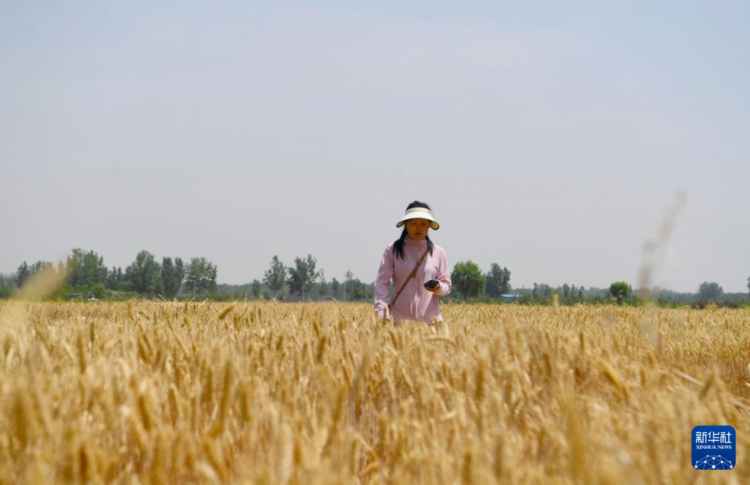 5月31日,在河南省开封市祥符区曲兴镇,杜梦园用农田测亩仪测量麦田面积。