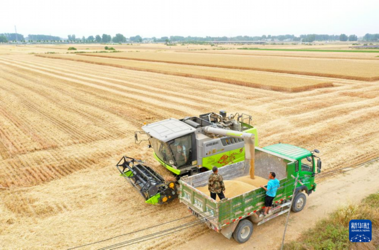 5月29日,在河南省平顶山市鲁山县马楼乡关庙杜村,杜梦园将收获的小麦装车(无人机照片)。