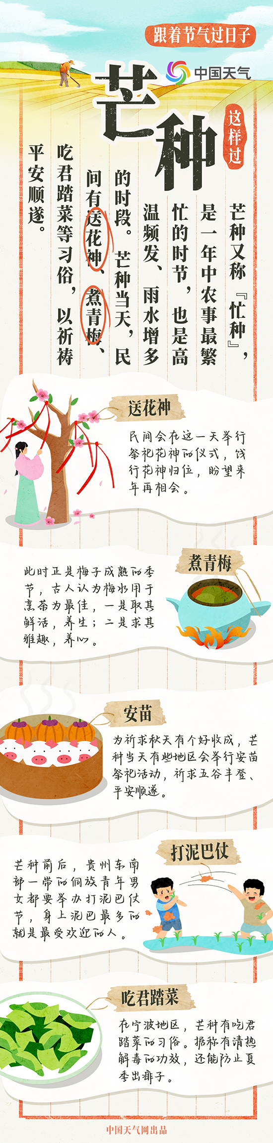 春生夏长,秋收冬藏,跟着节气过日子。今天(6月5日)进入夏天的第三个节气——芒种。芒种又称“忙种”,是一年中农事最繁忙的时节,也是高温频发、雨水增多的时段。为了祈求五谷丰登、平安顺遂,民间有送花神、煮青梅、吃君踏菜等习俗。中国天气网特别推出芒种风俗图鉴和芒种全国天气地图,看看这个节气怎么过。