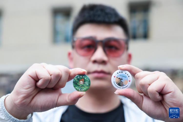 6月4日,在赵家镇走马岗古道徒步入口的宣家山村的“走马岗绿色银行”礼品兑换点,游客展示兑换的“环保卫士”徽章。