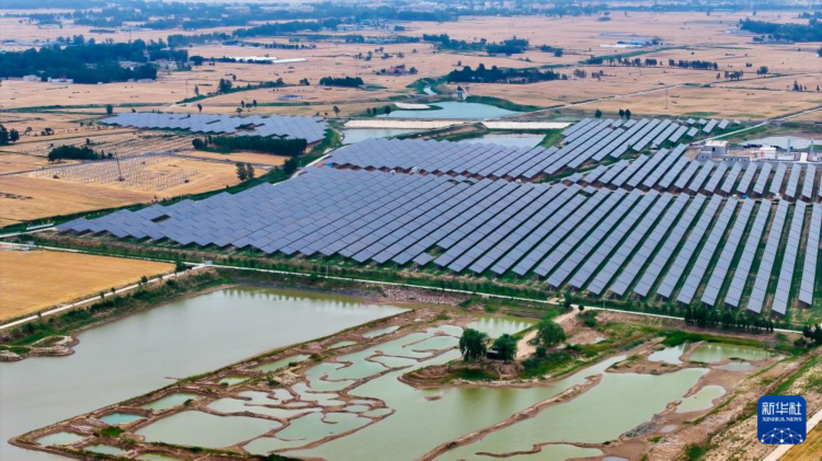 6月4日拍摄的嘉祥县梁宝寺镇利用采煤塌陷区建设的华能嘉祥梁宝寺光伏项目(无人机照片)。