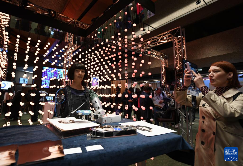 5月30日,在瑞士日内瓦举行的2024年“人工智能造福人类全球峰会”上,参会者用手机拍摄绘画艺术家机器人Ai-Da。