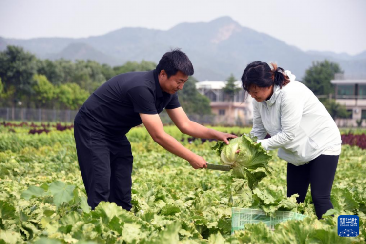 6月5日,工作人员在北京市平谷区兴谷街道中胡家务村“博士农场”采摘生菜。
