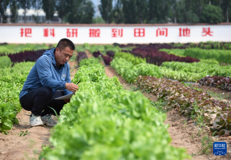 6月5日,工作人员在北京市平谷区兴谷街道中胡家务村“博士农场”查看生菜生长情况。