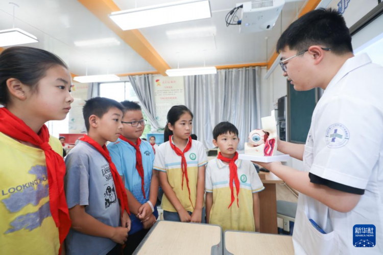 6月5日,东林镇卫生院的医生给小学生们介绍眼球结构。