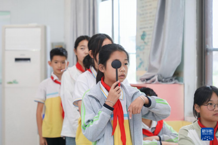 6月5日,东林二小的学生们在爱眼知识课上测视力。