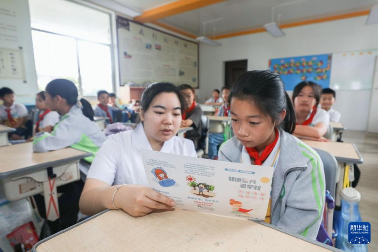 6月5日,东林镇卫生院的医生给小学生们介绍眼球结构。