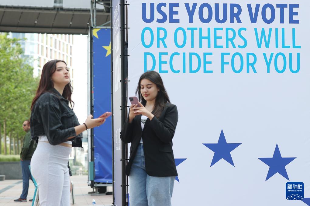 6月6日,在位于比利时布鲁塞尔的欧洲议会大楼外,人们从选举投票宣传广告下走过。新华社记者 赵丁喆 摄