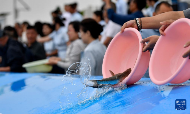 6月6日,工作人员在银川黄河外滩国家湿地公园向黄河放流鱼类。