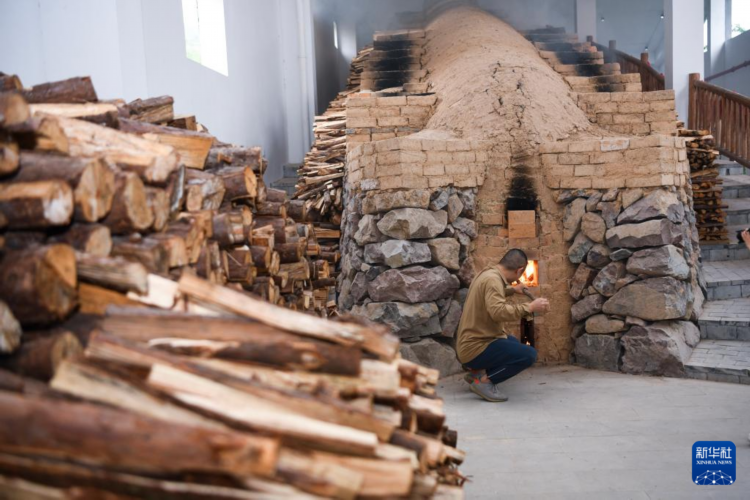 5月31日,在慈溪市上林湖青瓷传承园,工作人员为龙窑添柴烧火。