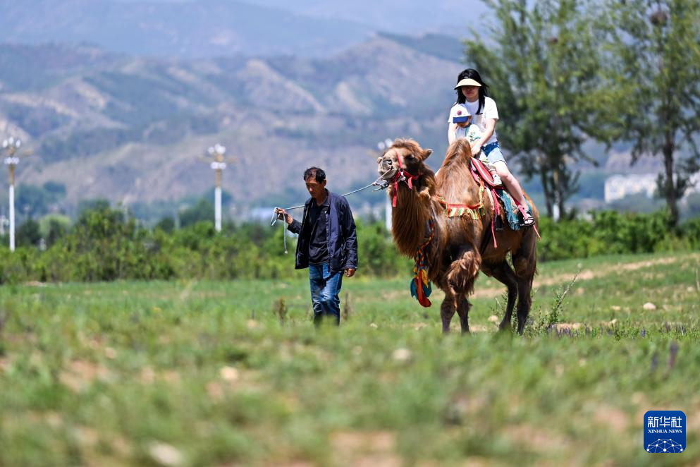 6月9日,游客在呼和浩特市敕勒川草原骑骆驼。