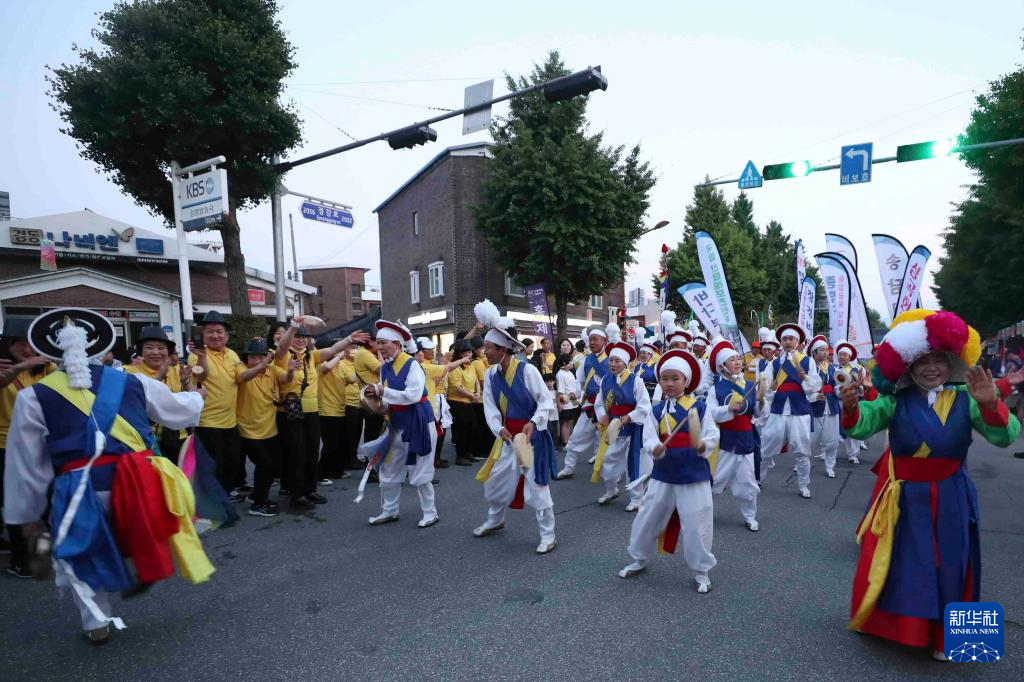 6月8日,韩国江陵民众在一年一度的民俗联欢上表演农乐。