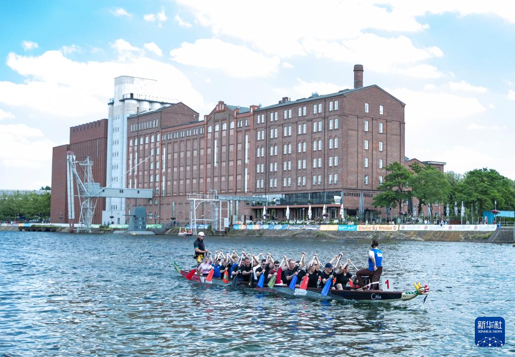 6月8日,选手们在德国杜伊斯堡参加2024趣味龙舟赛。