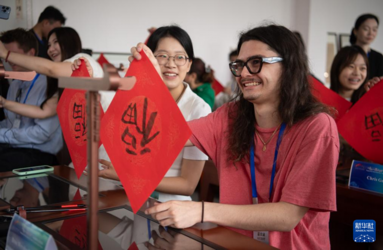 6月8日,在湖北第二师范学院,美国青年体验书法课。