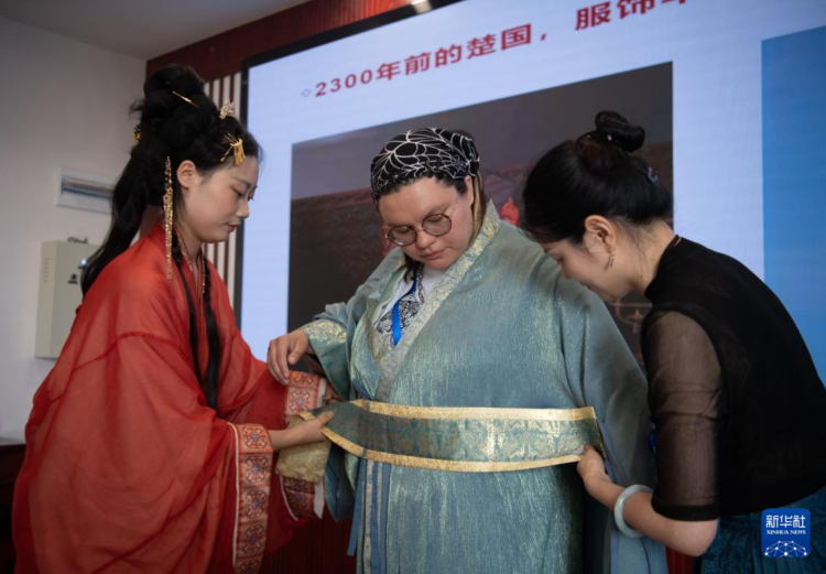 6月8日,在湖北第二师范学院,美国青年体验传统服饰。