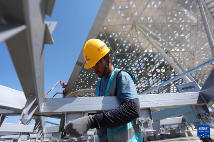 在北京城市副中心站综合交通枢纽工程施工现场,工程主体结构、装饰装修、“京帆”屋盖施工和机电设备安装等正有序推进。为了应对高温天气的影响,建设施工方通过调整户外施工人员作业时间,发放防暑药品、饮品等方式保障户外施工人员的健康安全,确保工程建设稳步推进。
